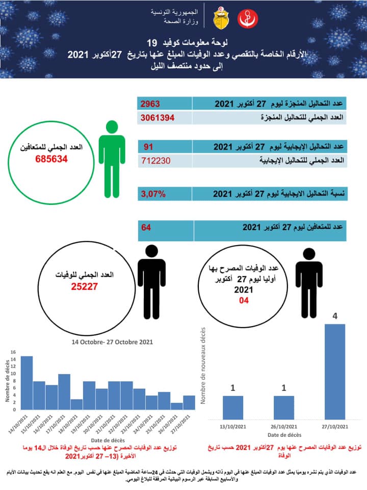 Selon un autre bilan publié le même jour, le ministère de la Santé, 91 tests positifs ont été recensés parmi 2963 tests le 27 octobre, portant le taux de positivité à 3.07%.