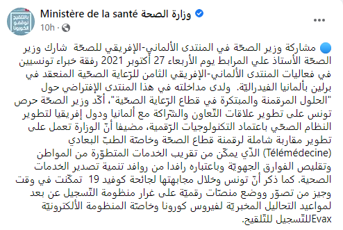 Lors de son intervention dans ce forum virtuel sur les « Solutions numériques et innovantes dans le secteur de la santé », le ministre de la Santé a réaffirmé la volonté de la Tunisie de développer des relations de coopération et de partenariat avec l’Allemagne et les pays africains pour renforcer le système de santé en adoptant les technologies numériques.