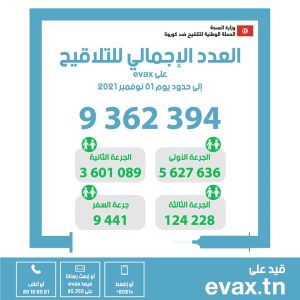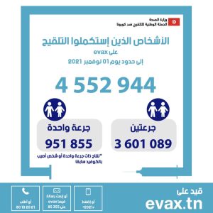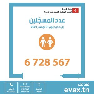 Le nombre de personnes inscrites à la plateforme nationale de vaccination contre le coronavirus evax.tn s’est élevé, le 2 novembre courant, à 6 millions 731 mille 625 personnes.