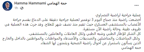 Dans un statut publié sur sa page officielle sur Facebook, le Secrétaire général du parti des travailleurs, Hamma Hammami a indiqué que Radhia Nasraoui a subi une délicate opération au cerveau dans le service de neurochirurgie de l’hôpital militaire.
