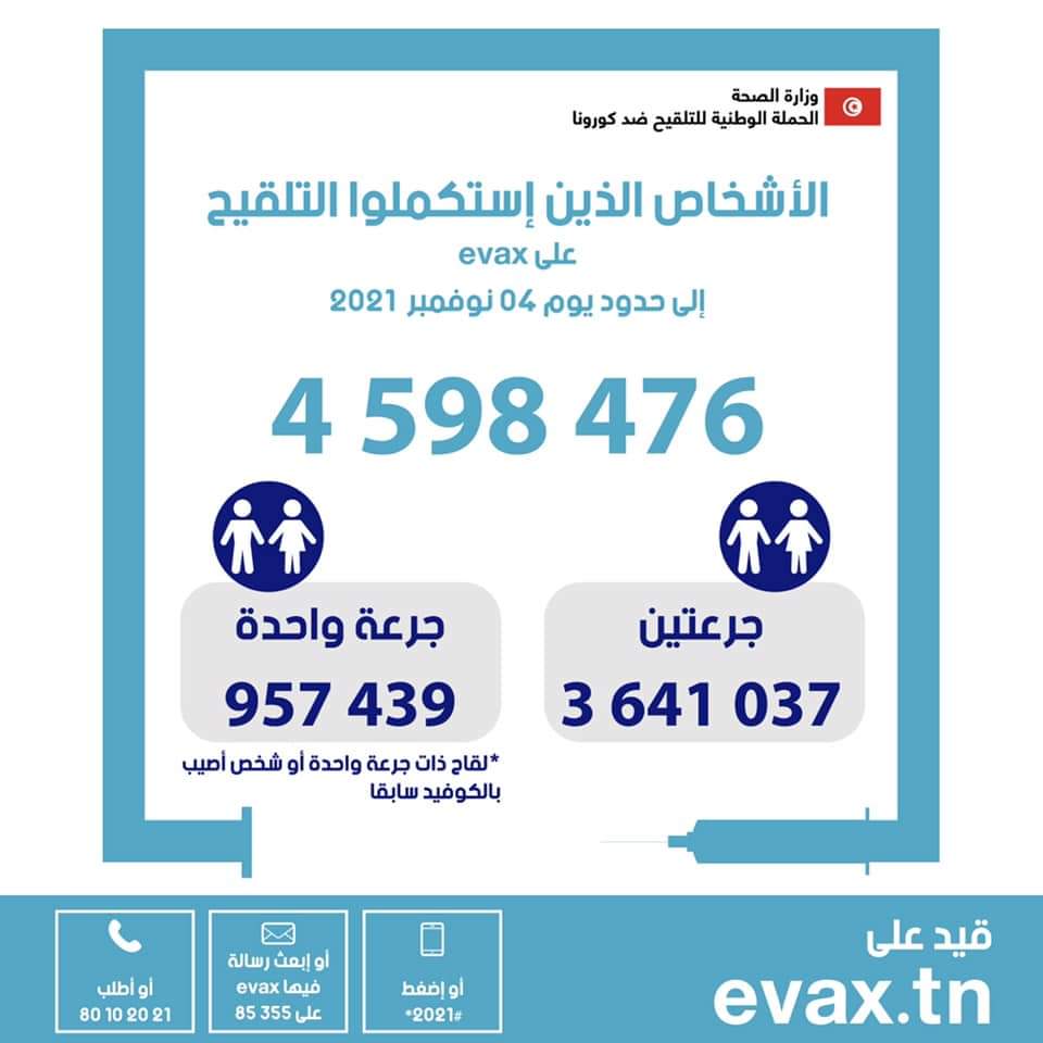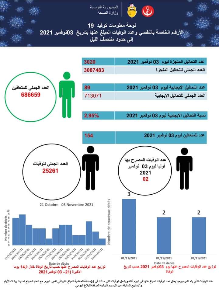 Dans son bilan quotidien publié sur sa page officielle, le ministère de la Santé a indiqué que le taux de positivité s’est élevé à 2.95% le 3 novembre 2021(89 tests positifs parmi 3020 tests) .