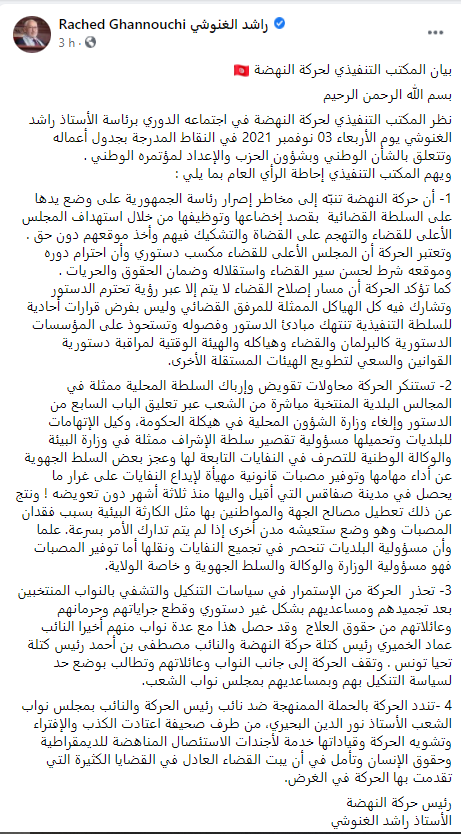 Le mouvement Ennahdha a mis l’accent sur la nécessité de garantir le bon fonctionnement de la justice et son indépendance, en affirmant que la réforme de la justice se fait à partir d’une vision conforme aux dispositions de la Constitution et en faisant participer toutes les structures concernées.