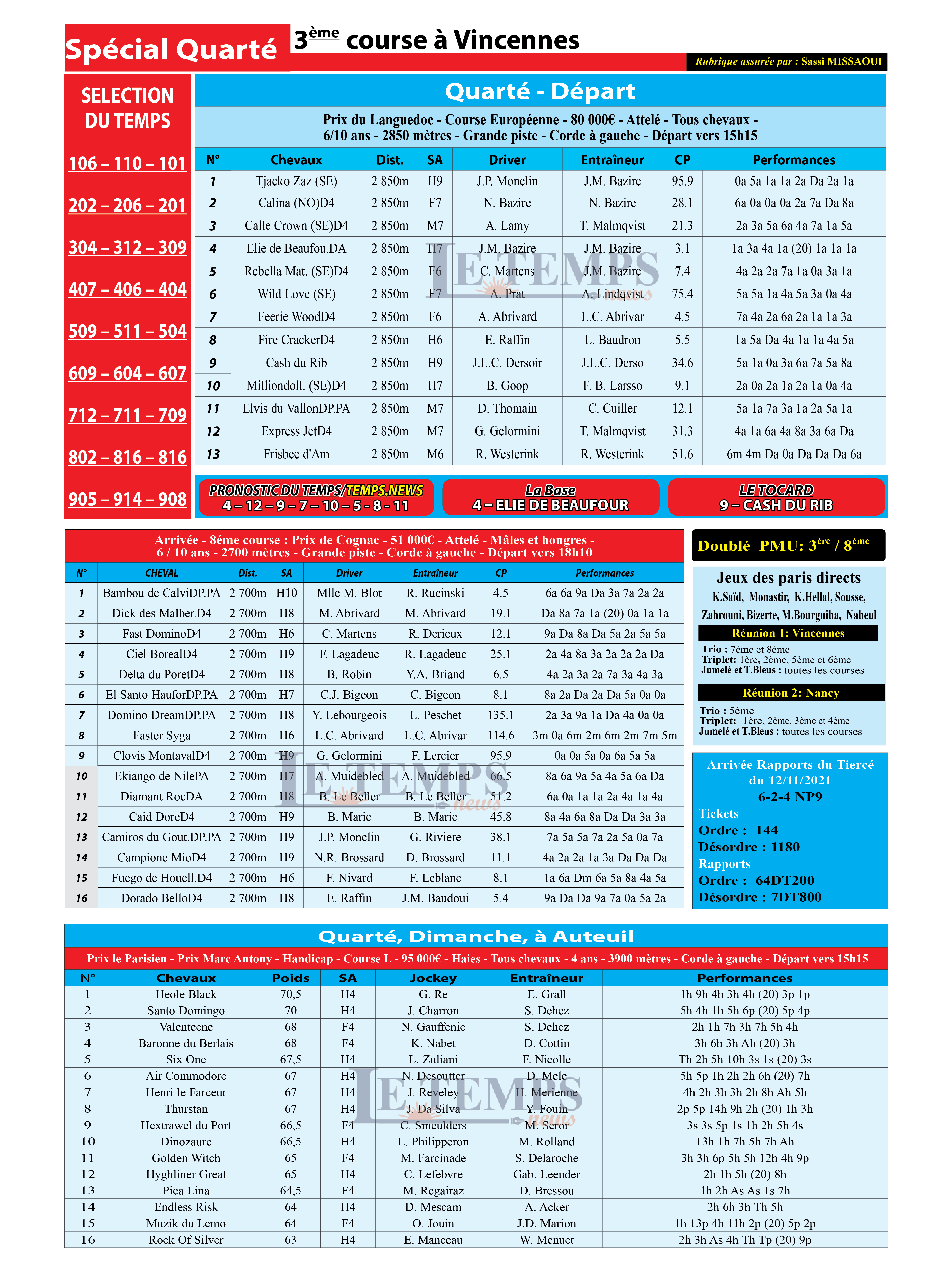Partager Facebook Twitter LinkedIn Pinterest Email Notre spécial Quarté d’aujourd’hui, 3ème course à Vincennes, donne notre pronostic du Temps/ Temps.news avec le cheval n° 4 Elie De Beaufour étant la base, tandis que le Tocard est le cheval n°9 Cash Du Rib. ATS PMU Quarté Quinté Tiercé Turf