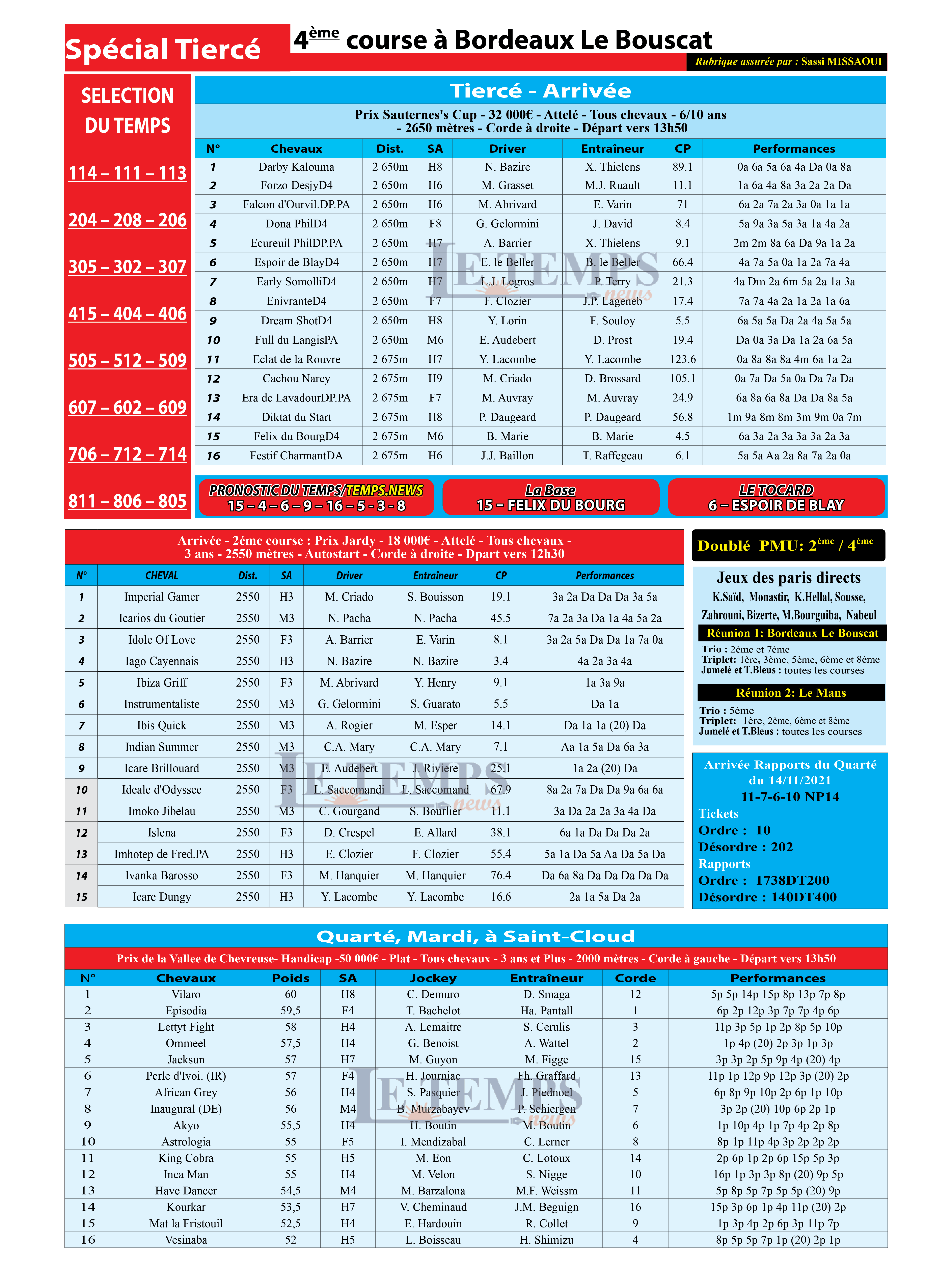 Partager Facebook Twitter LinkedIn Pinterest Email Notre spécial Tiercé d’aujourd’hui, 4ème course à Bordeaux Le Bouscat, donne notre pronostic du Temps/ Temps.news avec le cheval n°15 Felix Du Bourg étant la base, tandis que le Tocard est le cheval n°6 Espoir De Blay. PMU Quarté Quinté Tiercé Turf
