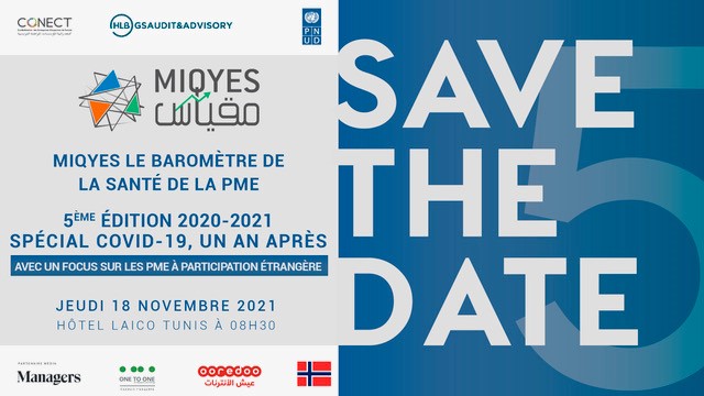 La présentation des  résultats de l’enquête de la cinquième édition de MIQYES 2020-2021, spécial COVID-19, un an après, avec un focus sur les PME à participation étrangère  aura lieu ce jeudi 18 novembre 2021 de 8H30 à 12H30 à l’hôtel Laico à Tunis, en présence de Mme Neila Gongi, Ministre de l’Industrie, de l’Energie et des Mines, de M. Tarak Cherif, Président du syndicatpatronal CONECT et de Mme Martine Therer, Représentante Résidente par intérim du PNUD en Tunisie.