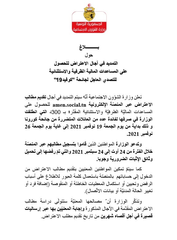 Le ministère des Affaires sociales a indiqué, dans un communiqué publié sur sa page officielle aujourd’hui, que les délais de recours via la plateforme électronique pour bénéficier de l’aide exceptionnelle de 300 dinars, au profit des catégories vulnérables impactées par la Covid-19, seront prolongés à partir de vendredi 19 jusqu’au 26 novembre 2021.