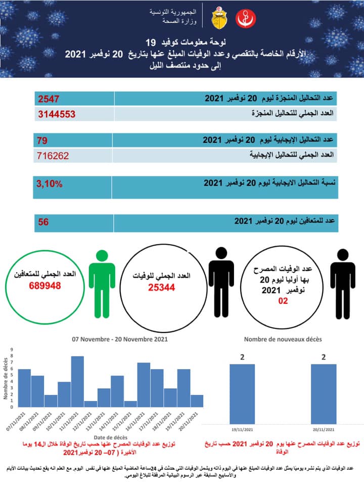 Le ministère de la Santé a indiqué, dans son bilan quotidien publié hier sur sa page officielle, que 79 tests positifs parmi 2547 tests ont été recensés portant, ainsi, le taux de positivité à 3.1%.