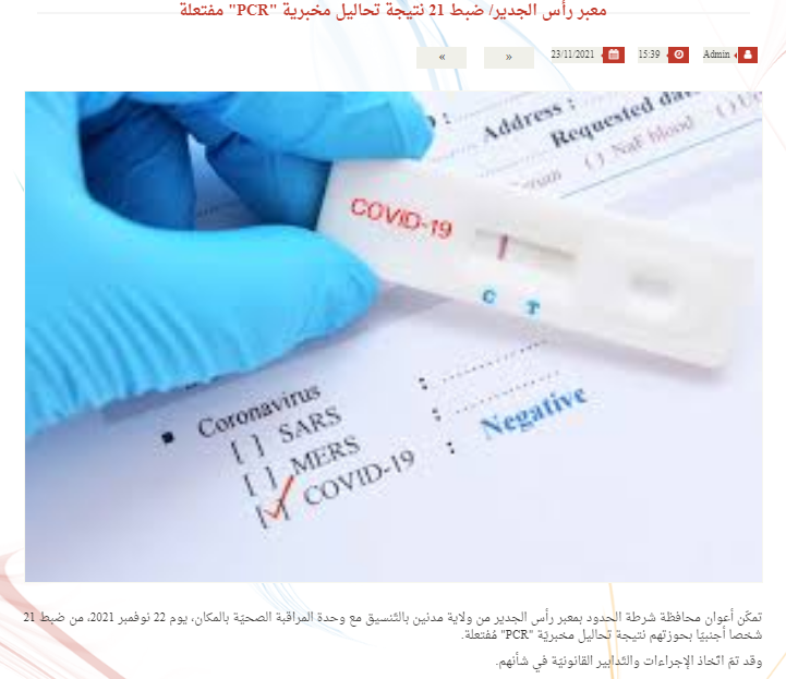Le ministère de l’Intérieur a indiqué, sur son site officiel, que les forces de l’ordre relevant du district de Médenine ont intercepté, hier, en coordination avec les unités de contrôle sanitaire, 21 personnes étrangères en possession de faux tests PCR.