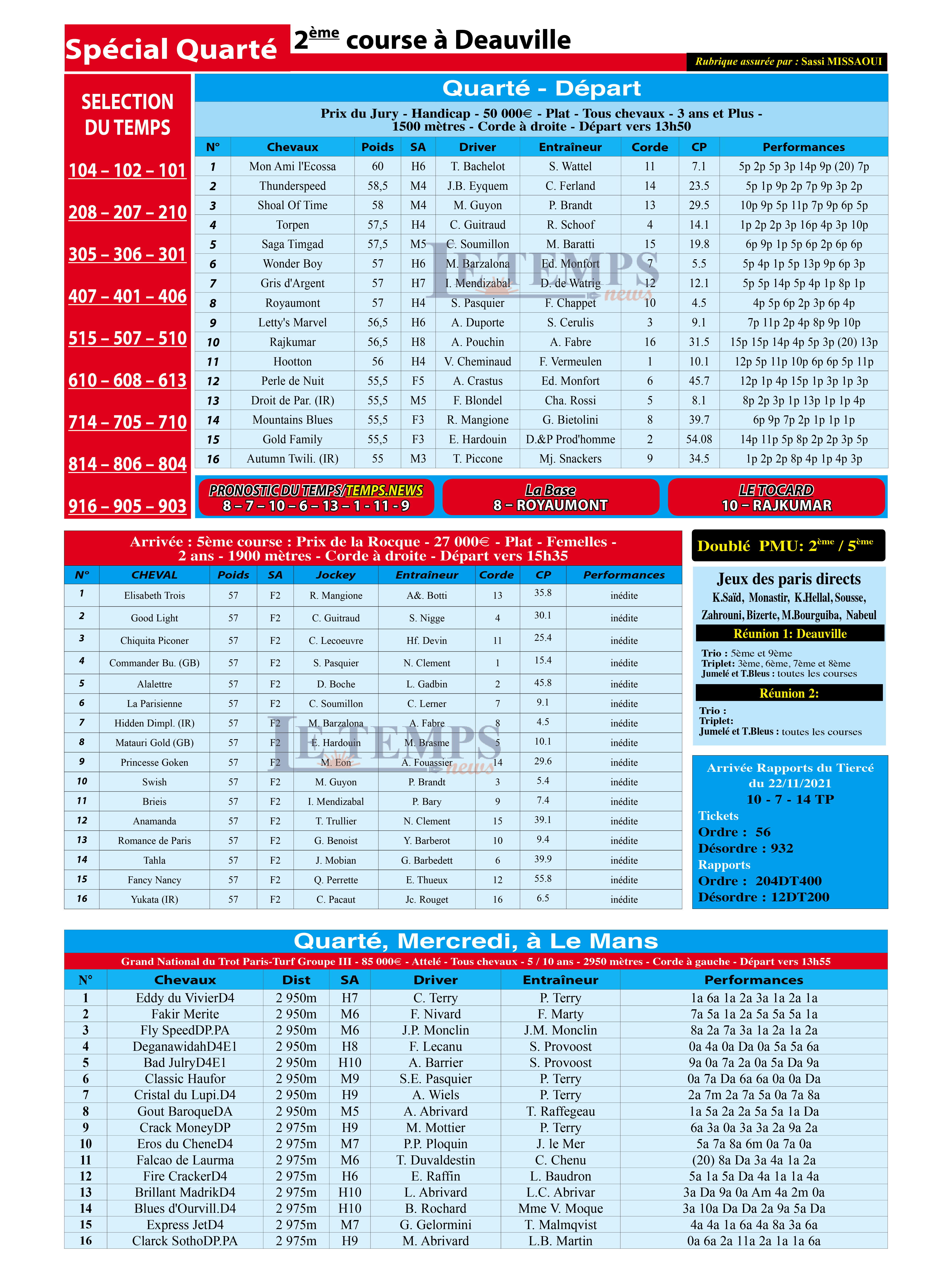 Partager Facebook Twitter LinkedIn Pinterest Email Notre spécial Quarté d’aujourd’hui, 1ère course à Deauville, donne notre pronostic du Temps/ Temps.news avec le cheval n° 8 Royaumont étant la base, tandis que le Tocard est le cheval n°10 Rajkumar. Quarté Turf