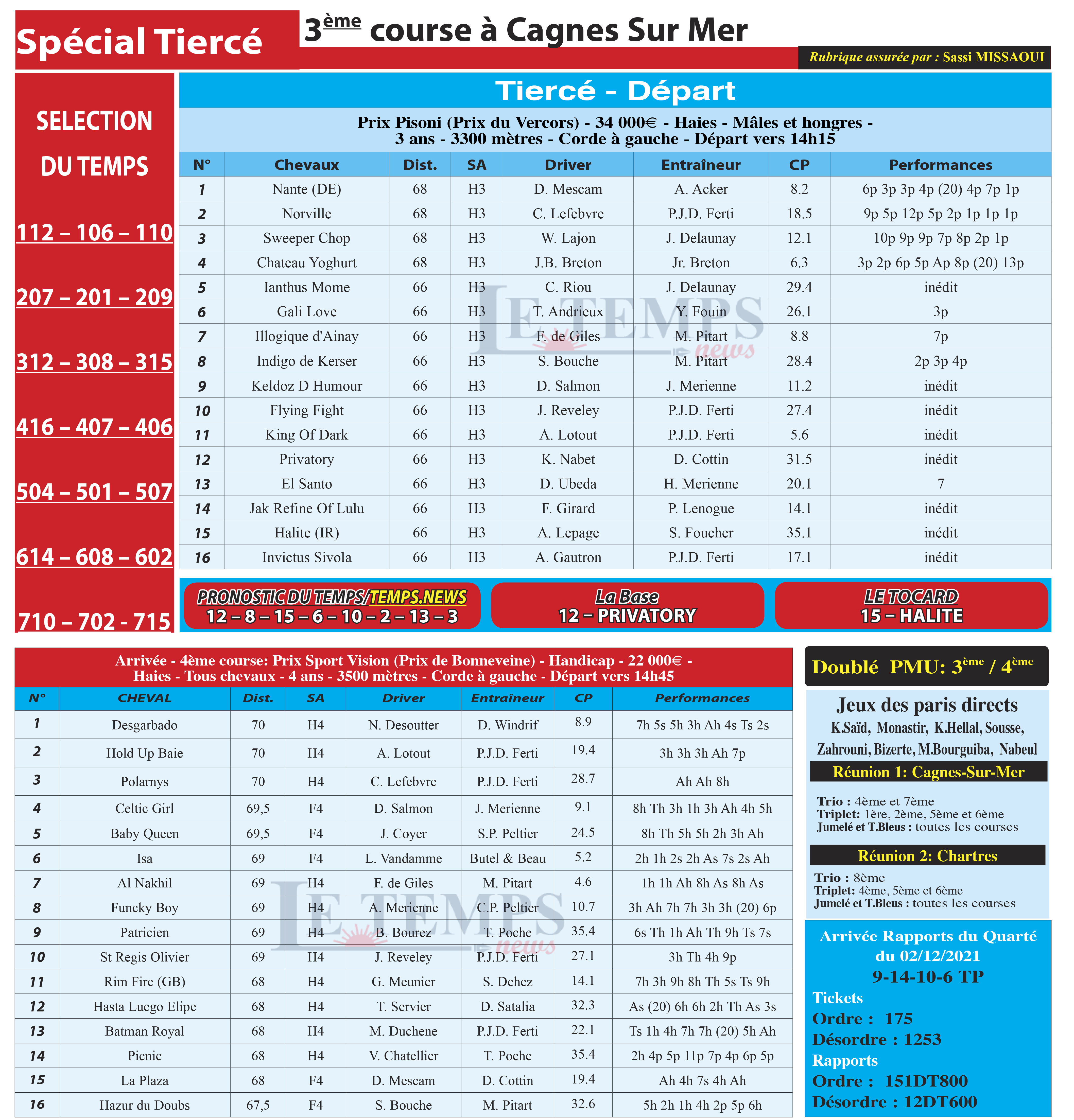Partager Facebook Twitter LinkedIn Pinterest Email Notre spécial Tiercé d’aujourd’hui, 3ème course à Cagnes-Sur-Mer, donne notre pronostic du Temps/ Temps News avec le cheval n°12 Privatory étant la base, tandis que le Tocard est le cheval n°15 Halite. Quarté Tiercé Turf