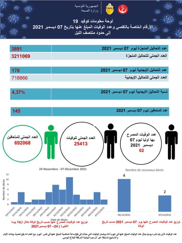 Le ministère de la Santé a indiqué, dans son bilan quotidien publié le 8 décembre, que 145 tests positifs parmi 3891 tests ont été recensés, le 7 décembre, portant, ainsi, le taux de positivité à 4.37%.