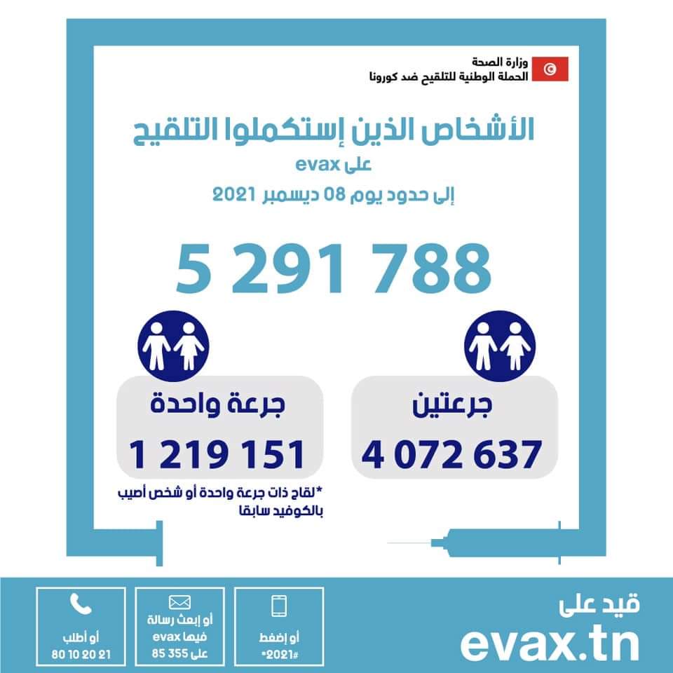 Le ministère de la Santé a indiqué, par ailleurs, dans son bilan quotidien publié le même jour, qu’environ 5.3 millions des Tunisiens sont totalement vaccinés jusqu’au 8 décembre : Plus de 4 millions ont reçu la première dose et environ 1.3 millions ont reçu la deuxième .