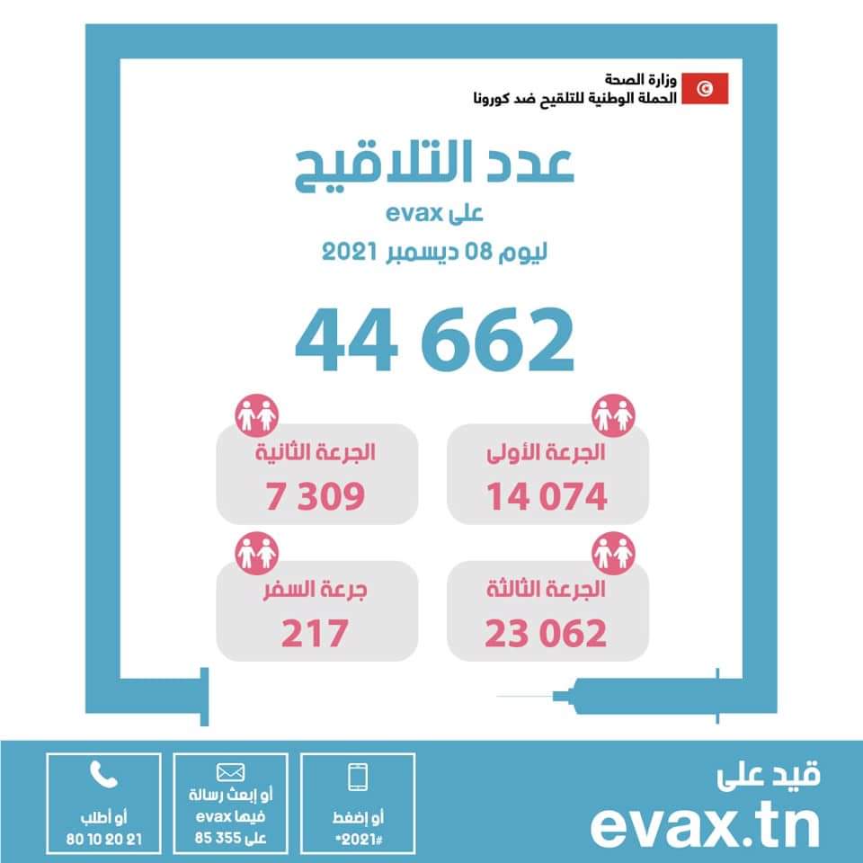 D’après la même source, le nombre total de vaccins administrés le 8 décembre a atteint 44662 vaccins : 14074 (pour la première dose), 7309 (pour la deuxième dose), 23062 (pour la troisième dose) et 217 doses de mobilité.