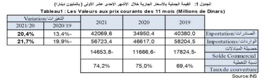 L’INS a, également, précisé que durant les onze mois de l’année 2021, les exportations ont enregistré une hausse de (+20,4%) contre une baisse de (-13,4%) durant les onze mois de l’année 2020.