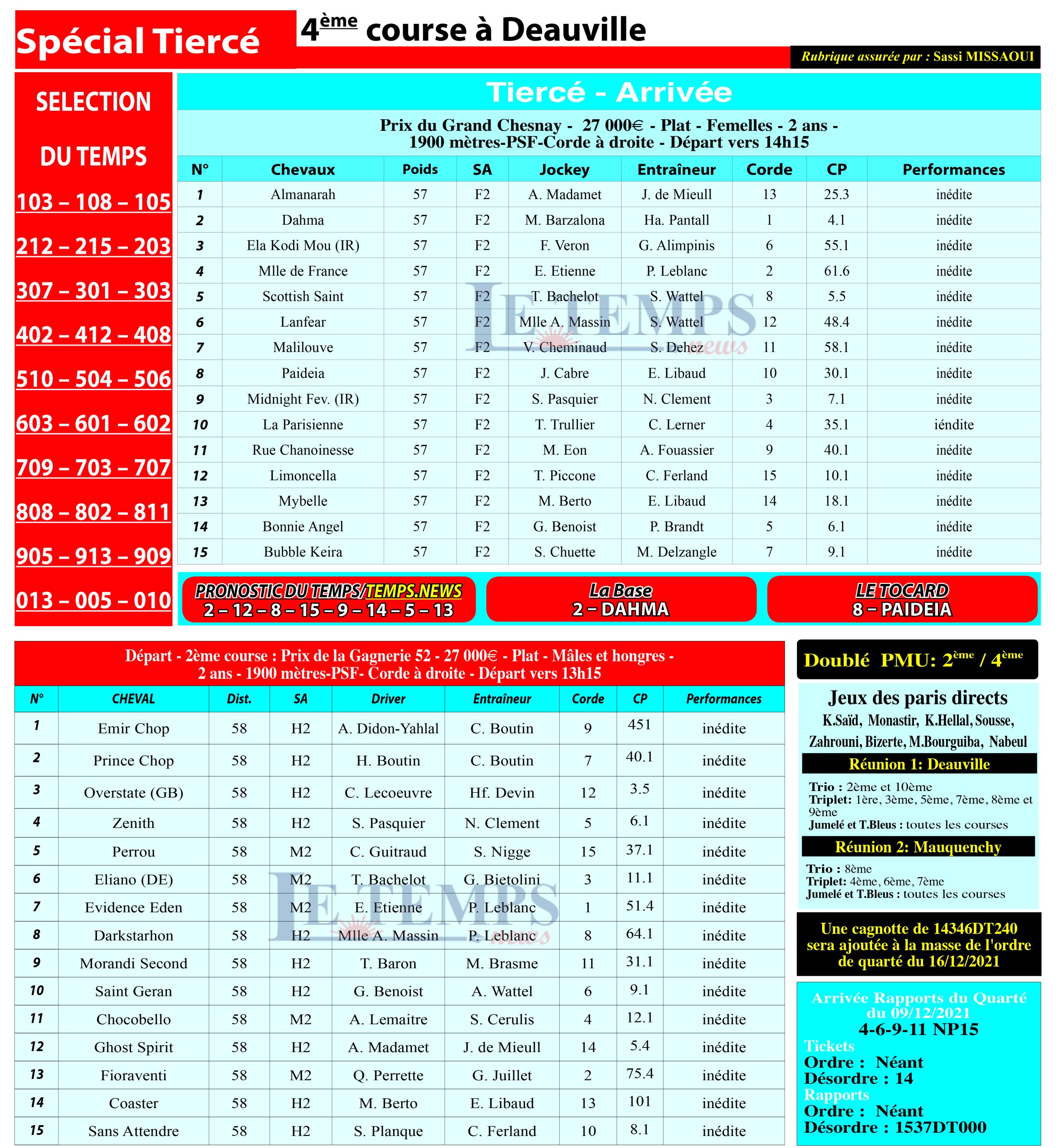 Notre spécial Tiercé d’aujourd’hui, 4ème course à Deauville, donne notre pronostic du Temps/ Temps News avec le cheval n°2 Dahma étant la base, tandis que le Tocard est le cheval n°8 Paideia.