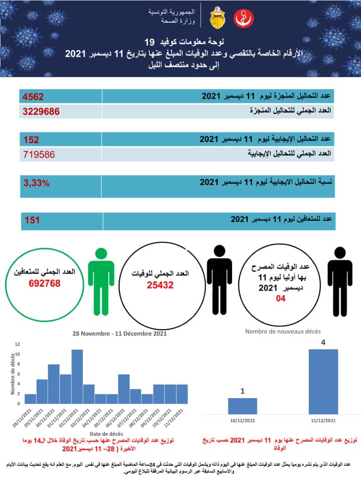 Le ministère de la Santé a indiqué, dans son bilan quotidien publié le 12 décembre, que 152 tests positifs parmi 4835 tests ont été recensés, le 11 décembre, portant, ainsi, le taux de positivité à 3.33%.