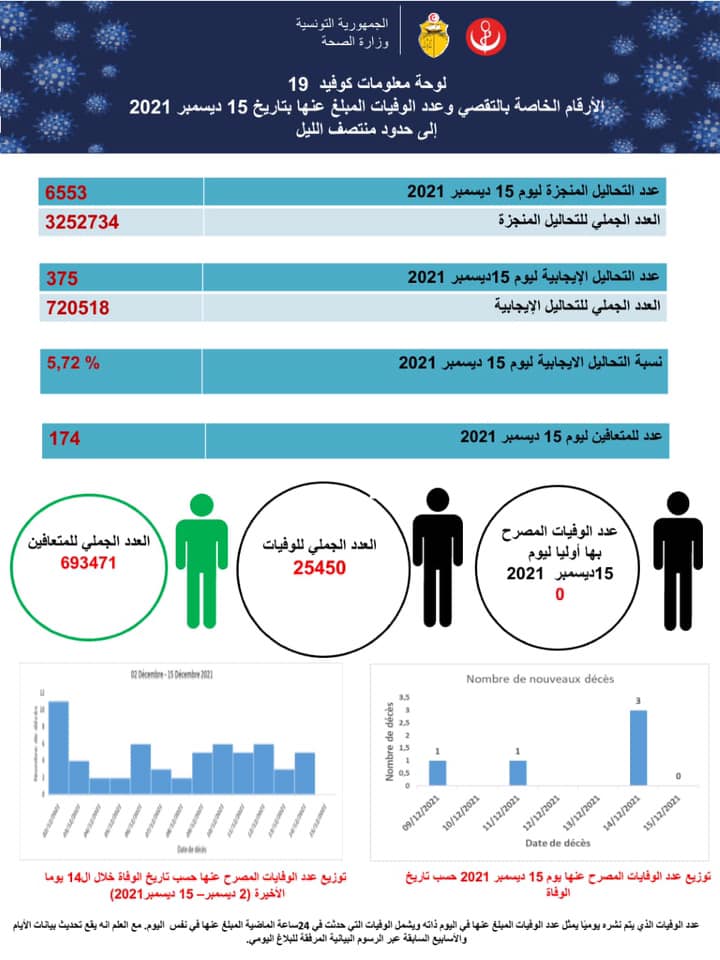 Le ministère de la Santé a indiqué, dans son bilan quotidien publié le 16 décembre 2021, que 375 tests positifs parmi 6553 tests ont été recensés, le 15 décembre, portant, ainsi, le taux de positivité à 5.72%.