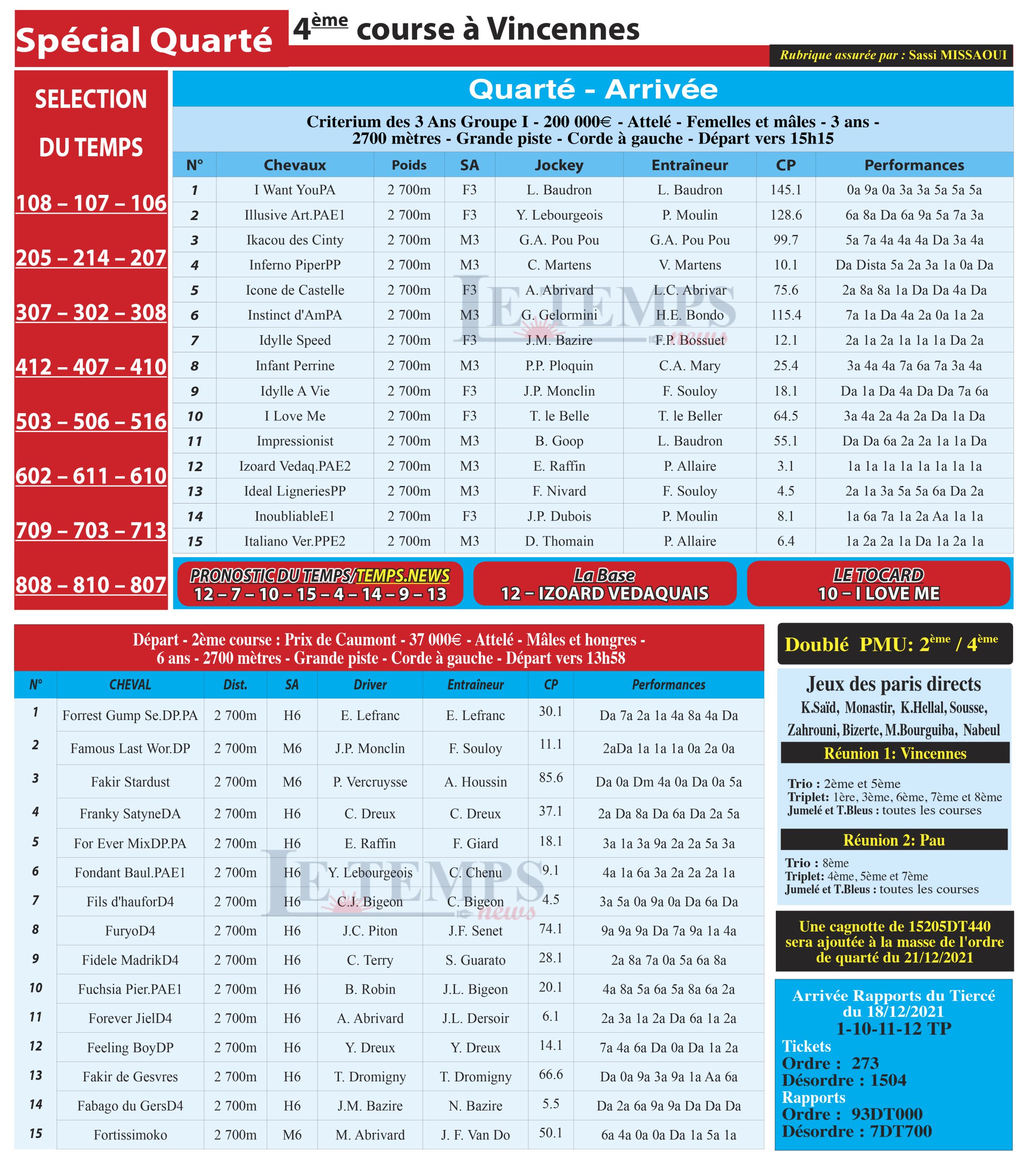 Partager Facebook Twitter LinkedIn Pinterest Email Notre spécial Quarté d’aujourd’hui, 4ème course à Vincennes, donne notre pronostic du Temps/ Temps News avec le cheval n°12 Izoard Vedaquais étant la base, tandis que le Tocard est le cheval n°10 I Love Me. PMU Quarté Tiercé Turf