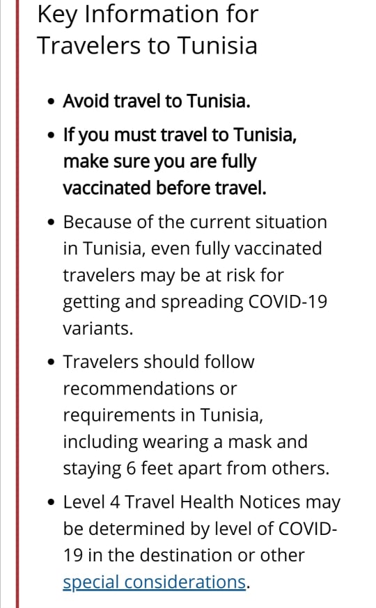 L’Ambassade des Etats-Unis a indiqué, dans un communiqué publié sur sa page officielle le 24 janvier 2022, que les Centres pour le contrôle et la prévention des maladies recommandent de ne pas se rendre dans 15 pays notamment la Tunisie, et ce à cause de la flambée des cas de contamination au coronavirus.