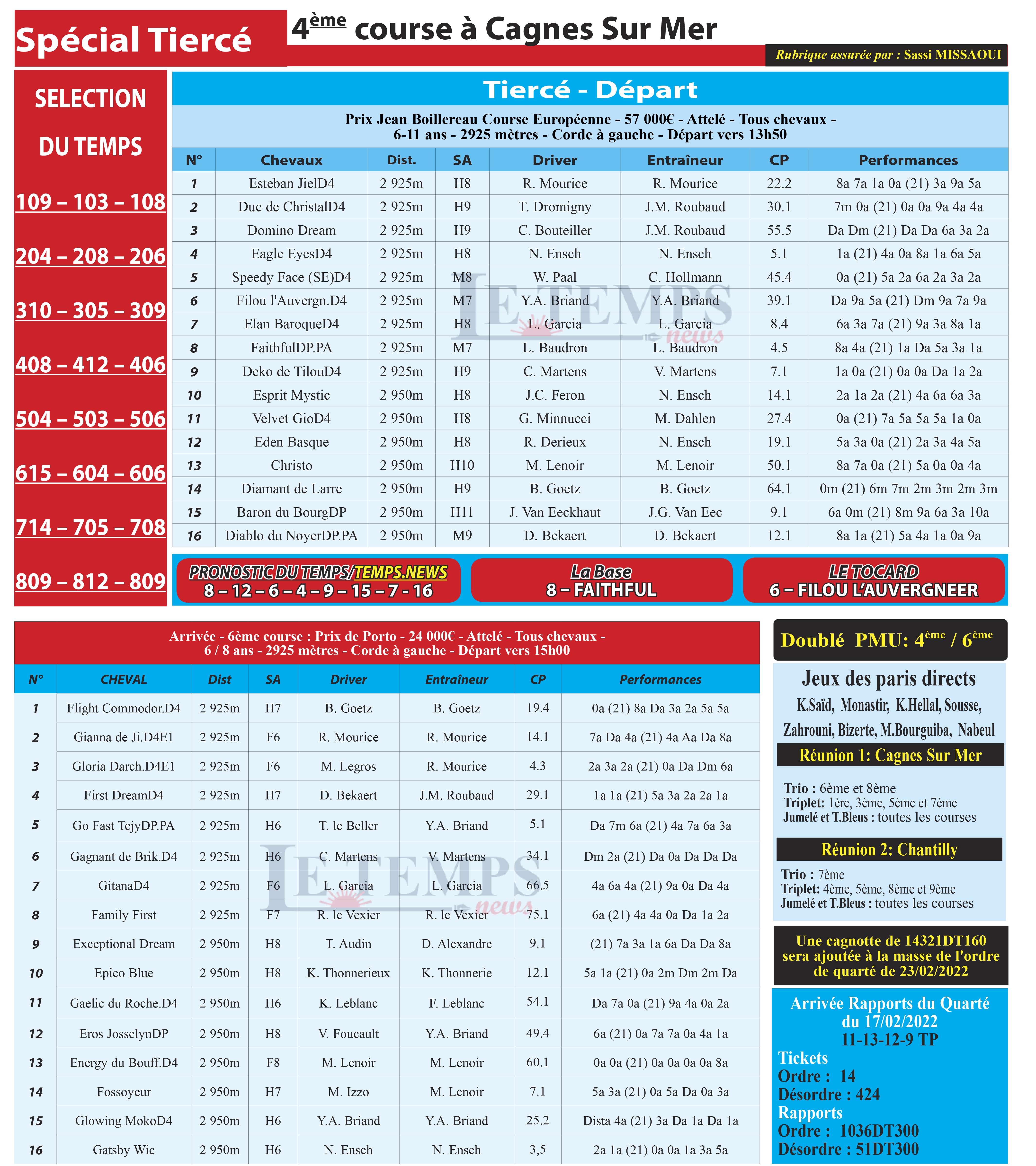 Partager Facebook Twitter LinkedIn Pinterest Email Notre spécial Tiercé d’aujourd’hui, 4ème course à Cagnes Sur Mer, donne notre pronostic du Temps/ Temps News avec le cheval n°8 Faithful étant la base, tandis que le Tocard est le cheval n°6 Filou L’Auvergneer. PMU Tiercé Turfiste