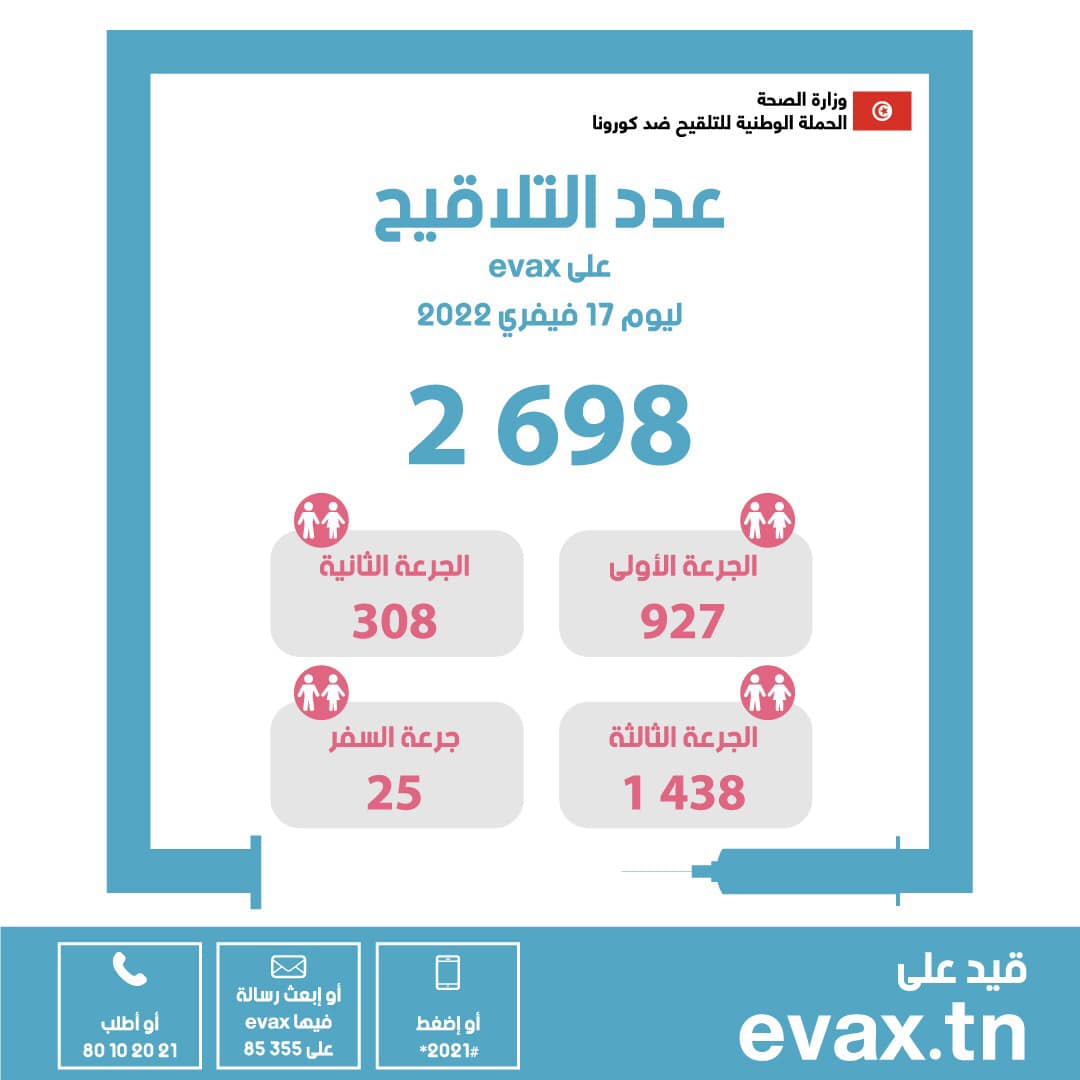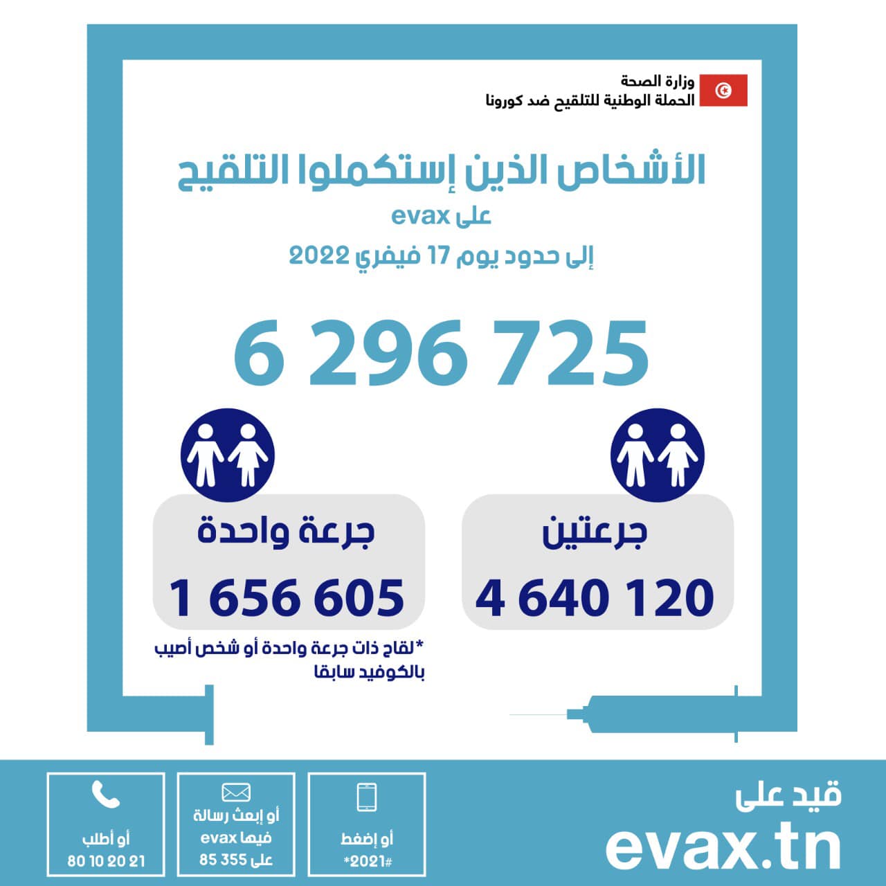 Le ministère de la Santé a indiqué  dans son bilan quotidien publié le 17 février 2022, que plus de 6.2 millions des Tunisiens sont totalement vaccinés jusqu’au 16 février. Plus de 4.6 millions ont reçu la première dose. Plus de 1.6 millions ont reçu la deuxième dose.