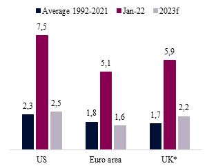 L’inflation aux États-Unis, au Royaume-Uni et dans la zone Euro n’a jamais atteint un niveau aussi élevé depuis le début des années 1990 et pourrait encore augmenter au cours des prochains mois (graphique 1). Cette situation devrait continuer à susciter des critiques désagréables pour les responsables politiques de la Banque d’Angleterre (BoE), de la Réserve Fédérale Américaine (Fed) et de la Banque Centrale Européenne (BCE).