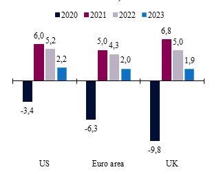 Les mesures de relance prises en réponse à la pandémie mondiale ont été importantes au cours des deux dernières années. Outre les mesures de relance budgétaire prises par les gouvernements, les banques centrales ont fourni une impulsion monétaire par le biais de baisses des taux d’intérêt et d’achats d’actifs. Une politique de soutien aussi importante était nécessaire pour éviter une récession beaucoup plus profonde et plus longue. En effet, il a permis aux principales économies développées de se redresser fortement en 2021 (graphique 2).