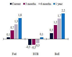 La BoE a déjà augmenté les taux d’intérêt britanniques à deux reprises, à partir de décembre. Et la Fed a accéléré la réduction de ses achats, de sorte que les taux d’intérêt pourront être revus à la hausse à partir mars. En revanche, en raison de la faiblesse de la reprise et de l’inflation dans la zone euro, la BCE ne devrait pas majorer ses taux d’intérêt avant le second semestre de l’année.