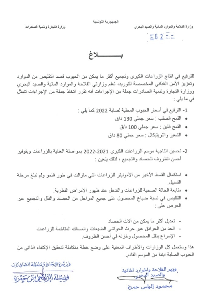 Dans un communiqué conjoint rendu public le 5 avril 2022, le ministère du Commerce et celui de l’Agriculture ont annoncé la hausse des prix des céréales en 2022. Les prix sont fixés sont comme suit: