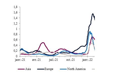 Pour conclure, nous regroupons nos principaux indicateurs et risques de pandémie. La pandémie s’estompe, mais le nombre de cas reste élevé, tout comme la probabilité que nous soyons confrontés à de nouvelles vagues avec l’apparition de nouvelles variantes. Cela signifie que l’économie mondiale devrait continuer à bénéficier du rebond de l’activité économique dans de nombreux pays. En revanche, les difficultés de la Chine face à Omicron pèseront sur l’économie mondiale en raison de la baisse de la consommation intérieure et de l’affaiblissement des exportations, ce qui augmentera la pression sur les transports maritimes et les chaînes d’approvisionnement.