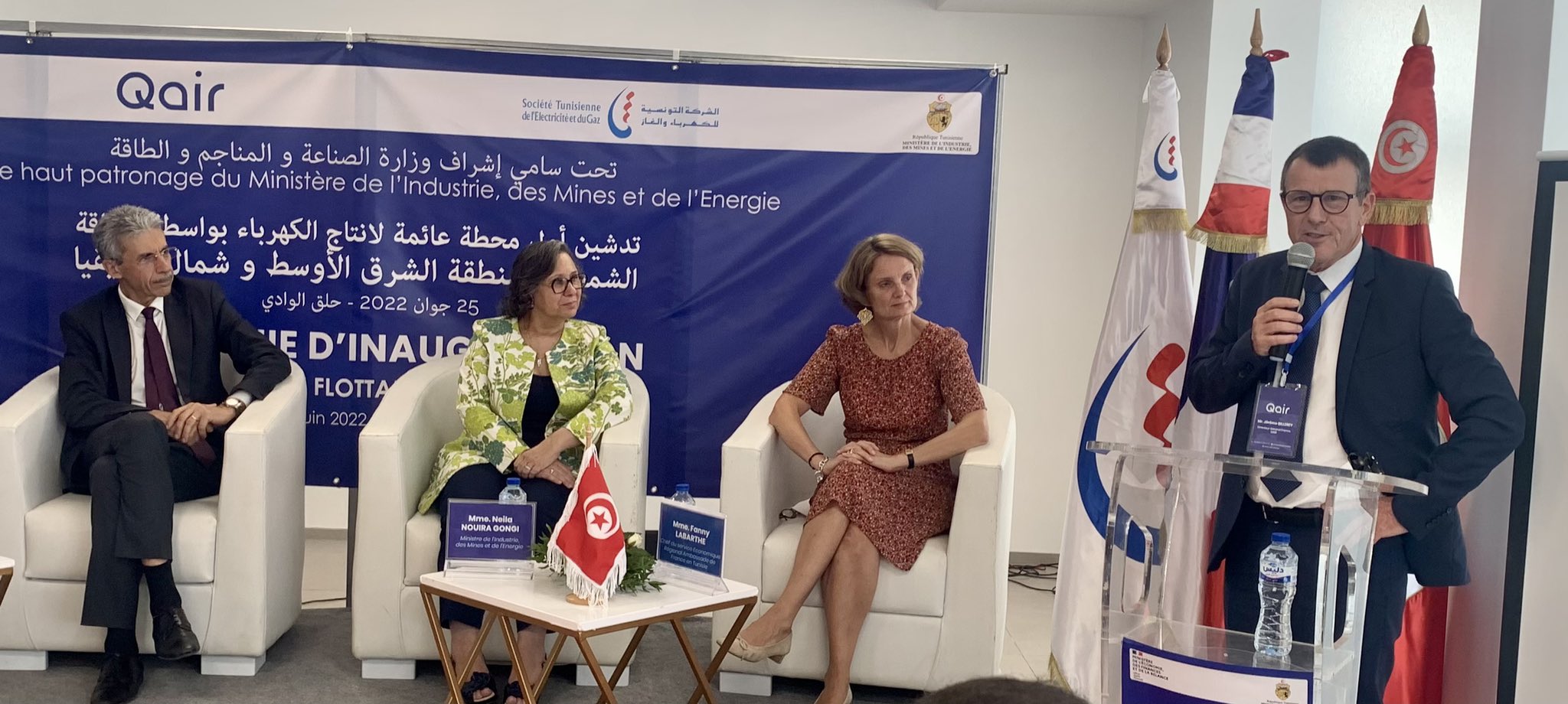 La première centrale solaire flottante en Tunisie et dans toute la zone Afrique du Nord et Moyen-Orient a été inaugurée le 25 juin 2022 par Neila NOUIRA GONGI, ministre de l’Industrie, des Mines et de l’Energie, Fatène Benhabylès-Foeth, ministre-conseillère de l’Ambassade de France en Tunisie, Hichem ANENE, PDG de la STEG et Jérôme BILLEREY, DG France de QAIR.