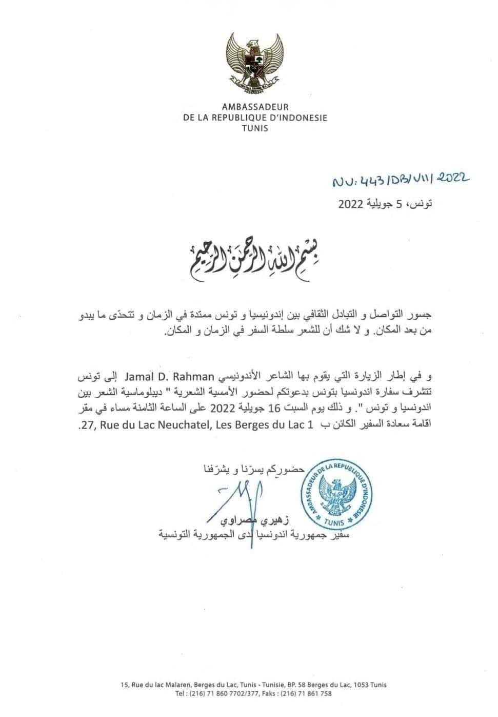 Dans la cadre des liens séculaire qui unissent l’Indonésie et la Tunisie à travers, entre autres, les échanges culturels et surtout la poésie qui demeure le royaume universel de rapprochement dans le temps et l’espace, que son excellence Zouheir Masraoui, Ambassadeur d’Indonésie en Tunisie, qui demeure un grand fan de la culture, comme le démontrent ses visites à la foire du livre à Bizerte, vient de profiter de la visite du grand poète indonésien, Jamel D. Rahman dans notre pays, pour organiser hier soir samedi à la résidence de l’Ambassadeur une rencontre poétique Indonésie-Tunisie.