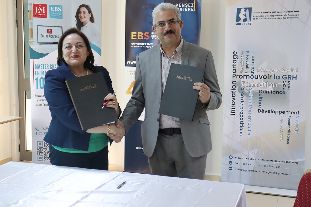 Un important accord de partenariat vient d’être signé entre l’Association des Responsables de Formation et de Gestion Humaine dans les Entreprises (ARFORGHE) et l’université privée tunisienne ESPIMA BUSINESS SCHOOL (EBS).