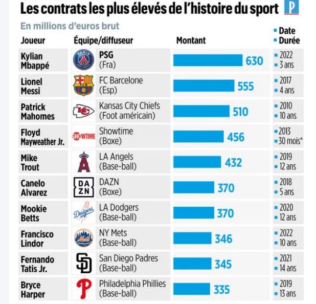 Au total, Kylian Mbappé pourrait donc empocher 630 millions d’euros s’il reste au club de la capitale jusqu’à la fin de son engagement. Sur le papier, il s’agit du plus gros contrat signé par un sportif, dépassant celui par son coéquipier Lionel Messi au FC Barcelone en 2017 (4 ans, 555 M€). Néanmoins, avec les polémiques entourant le décuple champion de France, il semble de moins en moins probable de voir le champion du monde 2018 honorer son contrat jusqu’à la fin…