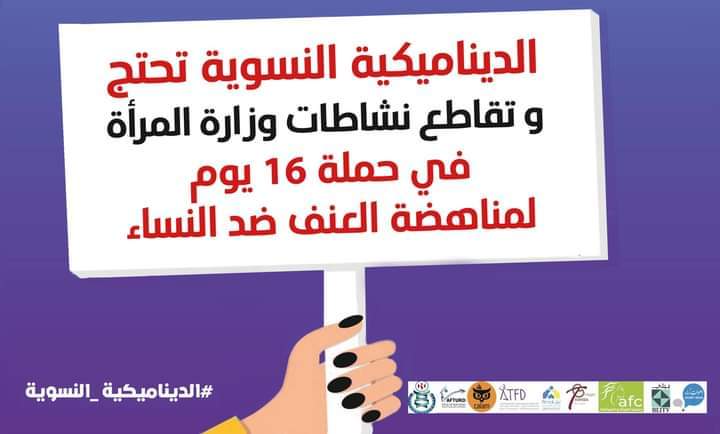 « En moins d’un mois, 4 femmes ont été tuées dans 4 régions différentes de la République tunisienne, tuées uniquement parce qu’elles étaient des femmes sous le silence suspect de l’État, et en l’absence quasi total des indicateurs et des statistiques officielles liées aux féminicides. Quatre ans se sont écoulés depuis l’entrée en vigueur de la loi contre la violence à l’égard des femmes, des femmes continuent d’être tuées en raison de l’indifférence des unités compétentes face aux risques menaçant la vie et la sécurité des victimes, de leur incapacité à bénéficier des protections prévues par la loi et du refus des juges, dans la plupart des cas, de répondre aux demandes de protection déposées par les femmes. Cinq années se sont écoulées depuis l’énonciation de la loi que l’État célèbre dans des forums et des événements et ne l’applique pas sur le terrain pour lutter contre le crime de violence sexiste, à cause de laquelle les femmes sont tuées et oubliées. Face à l’inaction de l’État et au silence injustifié, la dynamique féministe annonce son boycott des activités du ministère de la famille, de la femme, de l’enfant et des personnes âgées programmées dans le cadre de la campagne internationale des 16 jours de lutte contre la violence à l’égard des femmes, pour protester contre le silence complice et la faiblesse des actions pour protéger les femmes victimes de violences..», lit-on dans le communiqué récemment publié.