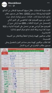 « Lors de sa conférence de presse tenue pour annoncer les résultats préliminaires (le 19 décembre 2022), l’ISIE a commis une erreur au niveau de l’annonce des résultats de la circonscription de Mejez El Bab – Gbollat – Testour (gouvernorat de Béja) où on a annoncé le passage du candidat Fouad El Matoussi au second tour (qui s’est classé troisième avec 899 votes), tandis que le candidat Moez Riahi est celui qui a obtenu la deuxième place avec 925 votes, comme le montre le récapitulatif révélant les résultats du centre de dépouillement dans la circonscription électorale. Les observateurs exigent que l’Instance corrige l’erreur et annonce le résultat correct, et exigent également que l’Instance publie les procès-verbaux de dépouillement détaillés au niveau des bureaux de vote dès que possible », lit-on dans un communiqué de Mourakiboun.