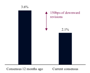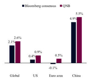 La plupart des analystes et des investisseurs restent pessimistes quant à l’évolution de la situation macroéconomique. Après plusieurs révisions à la baisse, les prévisions consensuelles de Bloomberg font état d’une expansion économique mondiale timide de 2,1 % en 2023, soit nettement moins que la moyenne à long terme de 3,4 %. Cela signifie que l’économie mondiale pourrait être qualifiée de « récessionnaire », si l’on utilise le seuil de 2,5 % fixé par le Fonds monétaire international pour définir une récession mondiale.