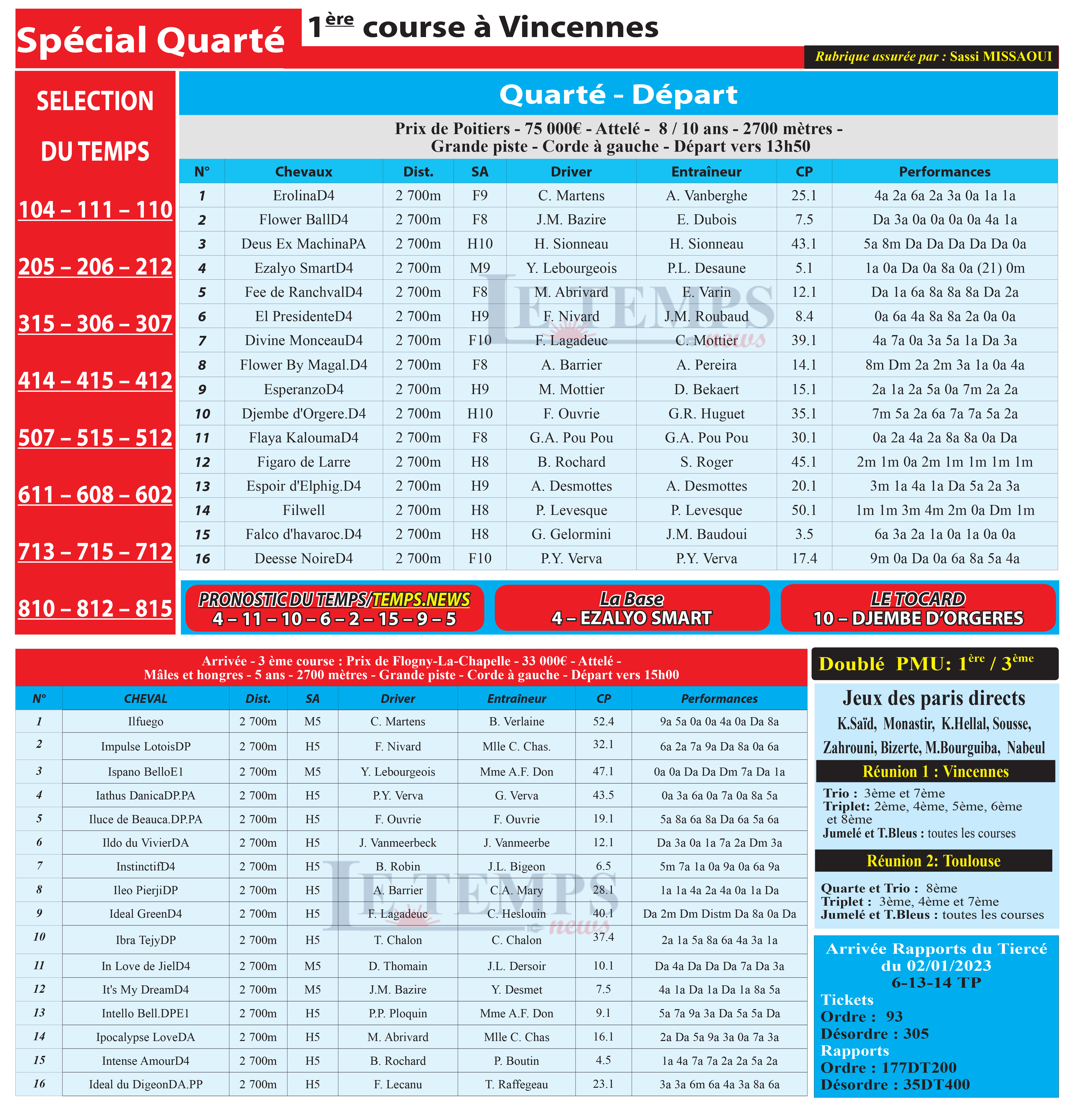 Notre spécial Quarté d’aujourd’hui, 1ère course à Vincennes, donne notre pronostic du Temps/ Temps News avec le cheval n°4 Ezalyo Smart étant la base, tandis que le Tocard est le cheval n°10 Djembe D’Orgeres.