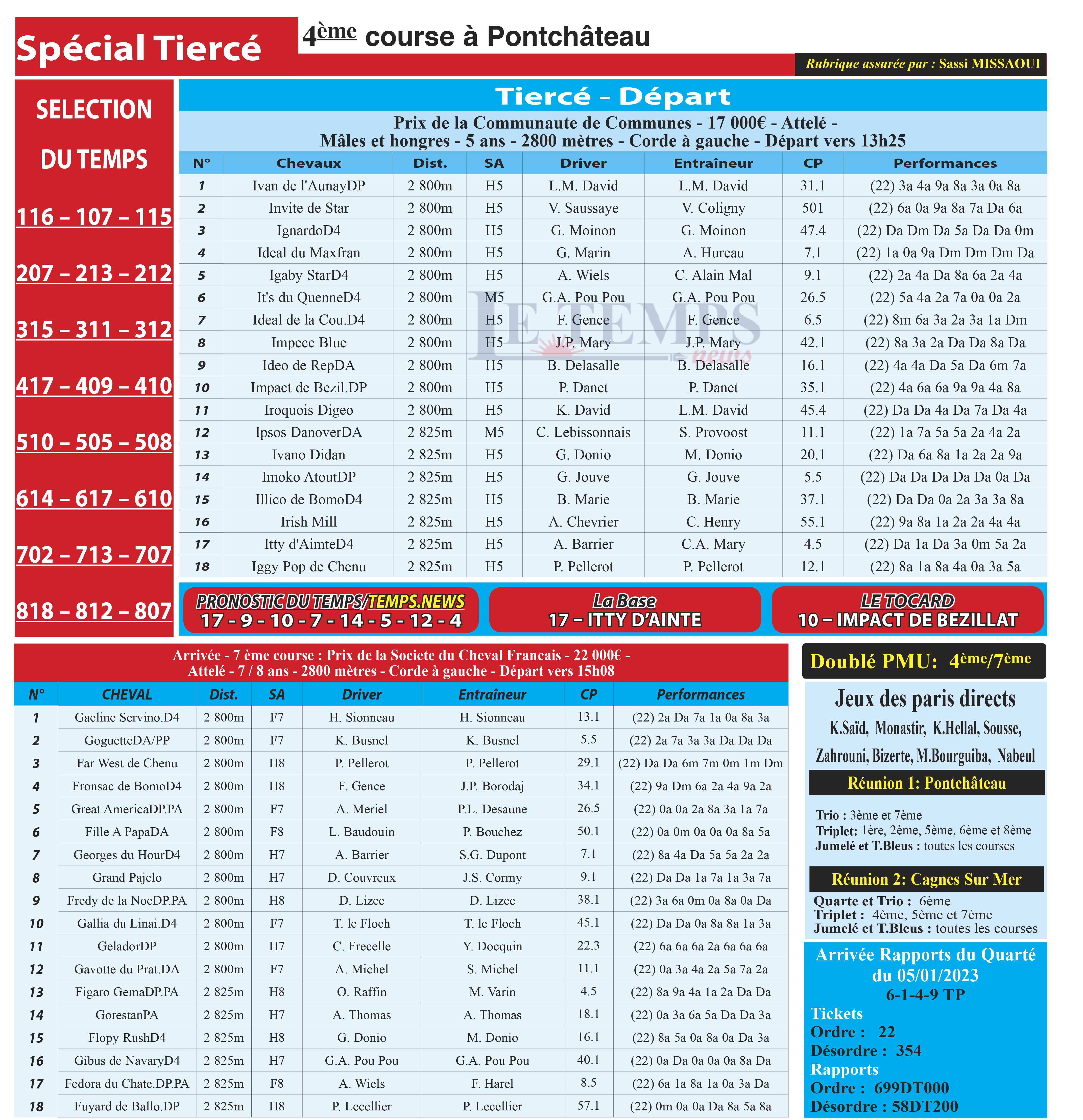 Notre spécial Tiercé d’aujourd’hui, 4ème course à Pontchâteau, donne notre pronostic du Temps/ Temps News avec le cheval n°17 Itty D’Ainte étant la base, tandis que le Tocard est le cheval n°10 Impact De Bezillat.