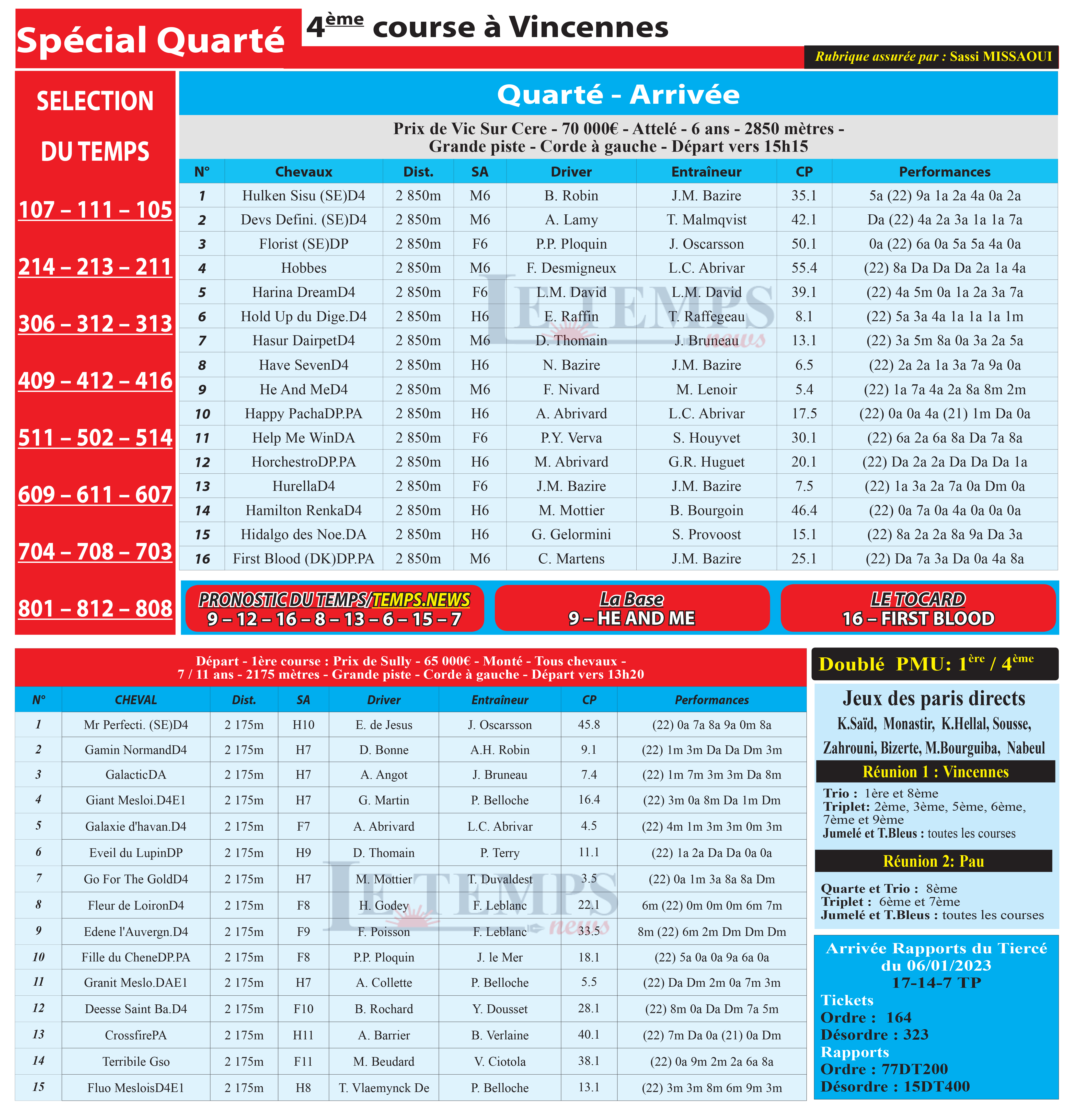 Partager Facebook Twitter LinkedIn Pinterest Email Notre spécial Quarté d’aujourd’hui, 4ème course à Vincennes, donne notre pronostic du Temps/ Temps News avec le cheval n°9 He And Me étant la base, tandis que le Tocard est le cheval n°16 First Blood. PMU Turf