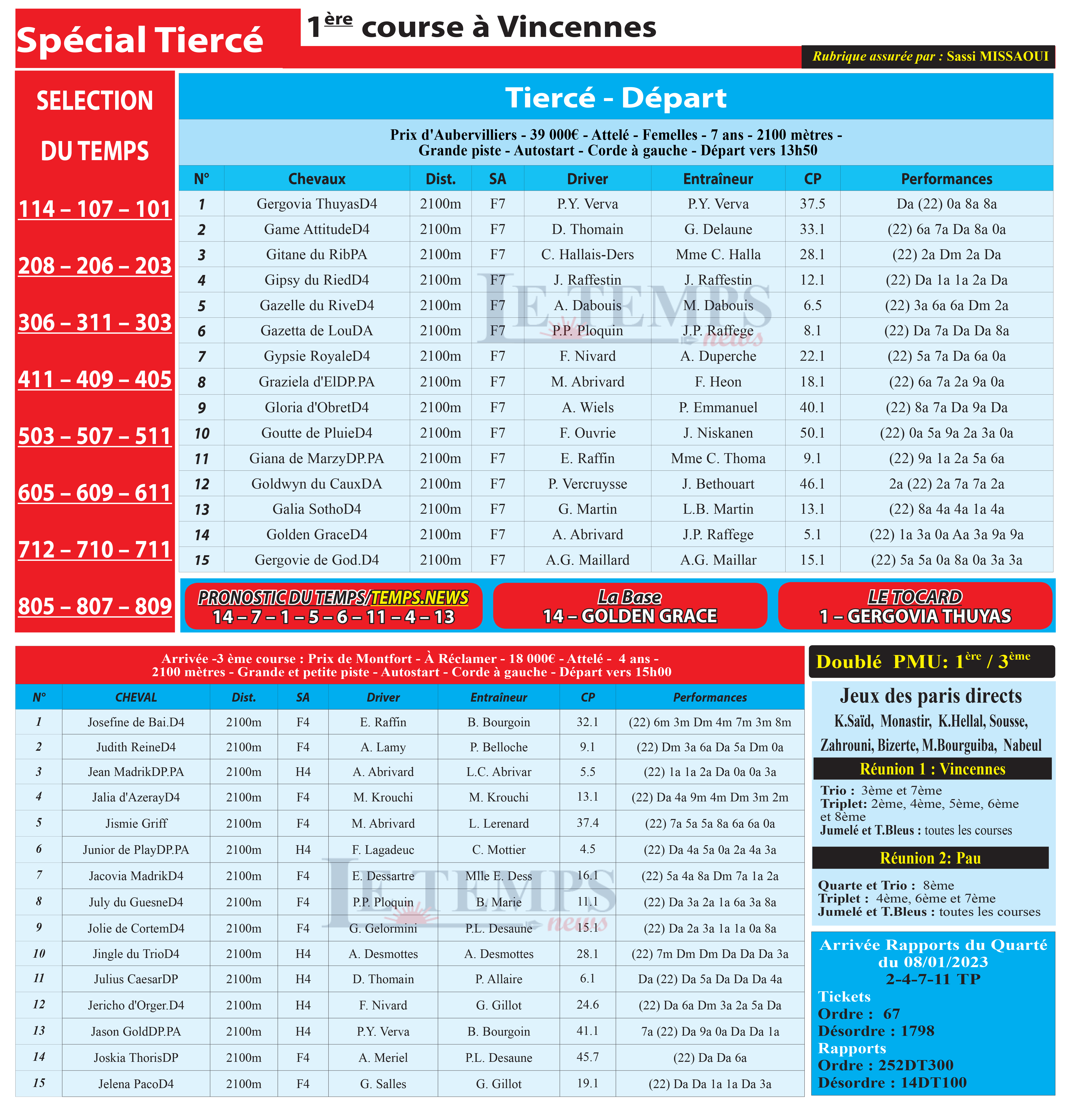 Partager Facebook Twitter LinkedIn Pinterest Email Notre spécial Tiercé d’aujourd’hui, 1ère course à Vincennes, donne notre pronostic du Temps/ Temps News avec le cheval n°14 Golden Grace étant la base, tandis que le Tocard est le cheval n°1 Gergovia Thuyas. PMU Turf