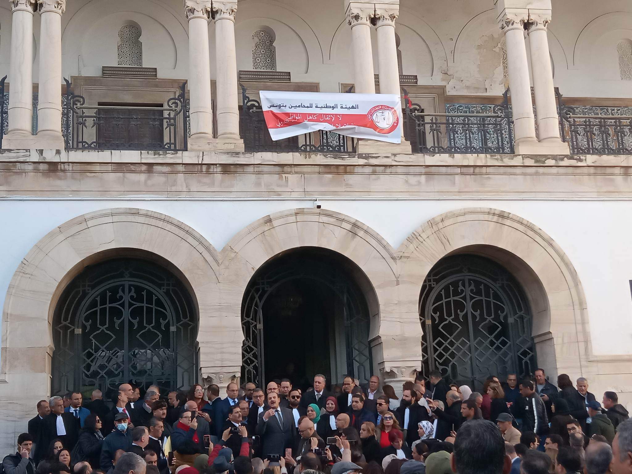Un rassemblement de solidarité avec l’avocat Ayachi Hammami s’est tenu ce mardi 10 janvier 2023 devant le tribunal de première instance de Tunis situé à Bab Bnet. Des représentants de différentes composantes de la société civile ont été présents sur les lieux, notamment l’Association tunisienne des femmes démocrates (ATFD), le Syndicat national des journalistes tunisiens (SNJT), l’Association tunisienne des Jeunes Avocats (ATJA), le Forum tunisien des droits économiques et sociaux (FTDES), ainsi que des membres de l’initiative « Citoyens contre le coup d’État », l’Association des Magistrats Tunisiens (AMT), et un certain nombre de journalistes et d’activistes à la société civile. L’affaire Ayachi Hammami a réussi, par ailleurs, à mobiliser toutes les sensibilités politiques, de l’extrême droite à l’extrême gauche, notamment Attayar (Courant Démocrate), le Parti des Travailleurs et le Parti d’Ennahdha, dont des représentants ont particpé au rassemblement.