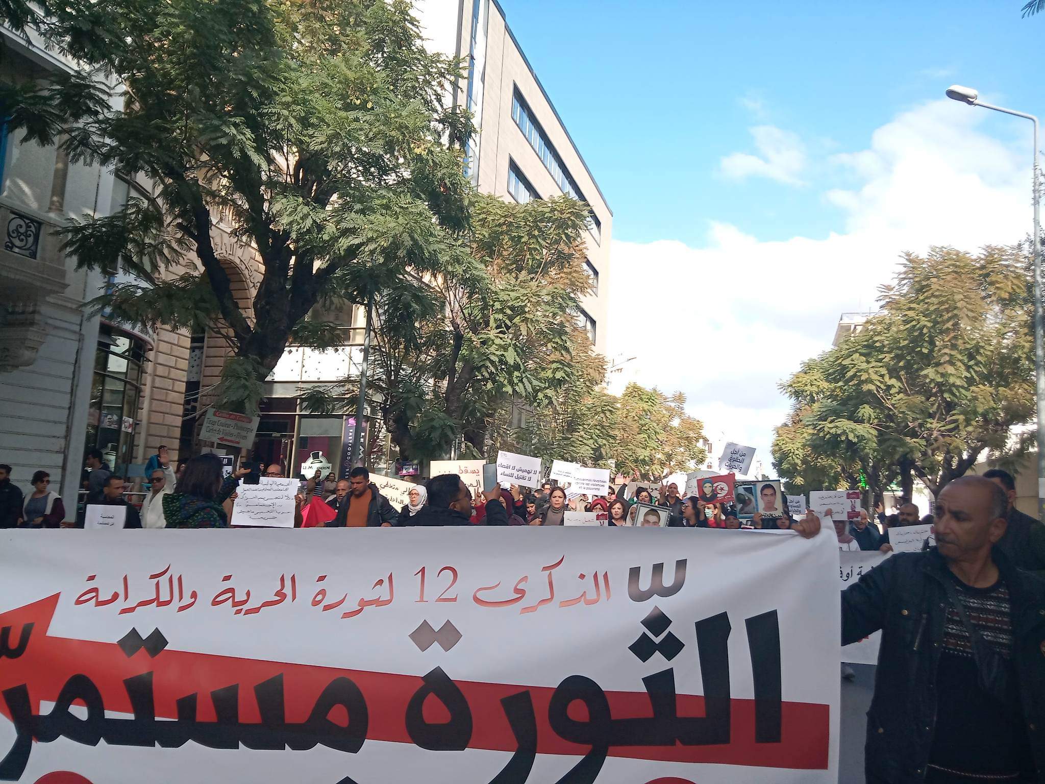 Comme prévu, un certain nombre d’activistes de la société civile et différents.tes représentants et représentantes de la société civile ont commencé à se rassembler devant le siège du Syndicat National des Journalistes Tunisiens pour participer à la commémoration du 14 janvier et de la révolution. Après des discours prononcés par certains représentants de l’ATFD et le SNJT, les manifestants ont lancé une marche vers l’avenue Habib Bourguiba.