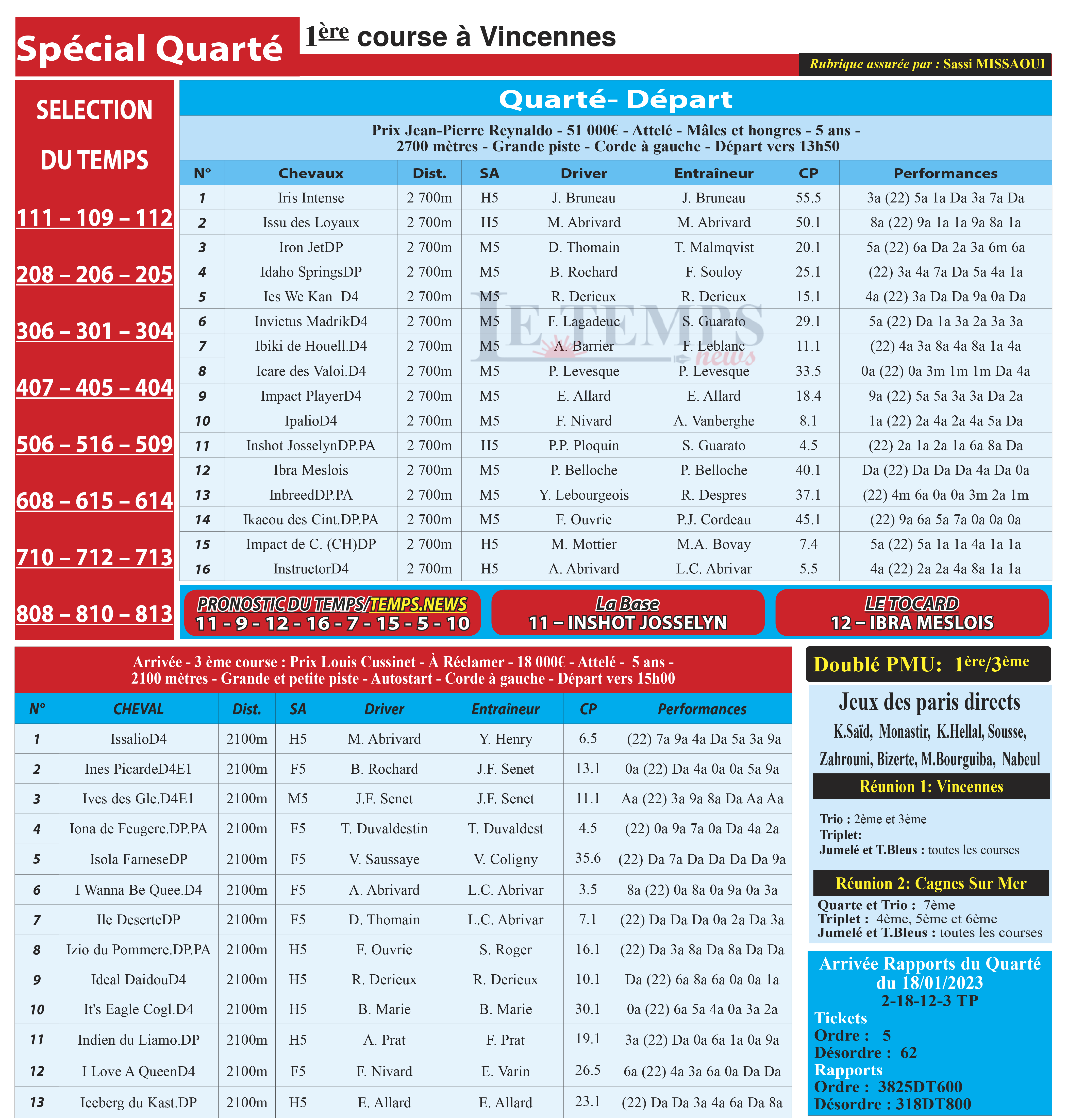 Notre spécial Quarté d’aujourd’hui, 1ère course à Vincennes, donne notre pronostic du Temps/ Temps News avec le cheval n°11 Inshot Josselyn étant la base, tandis que le Tocard est le cheval n°12 Ibra Meslois.