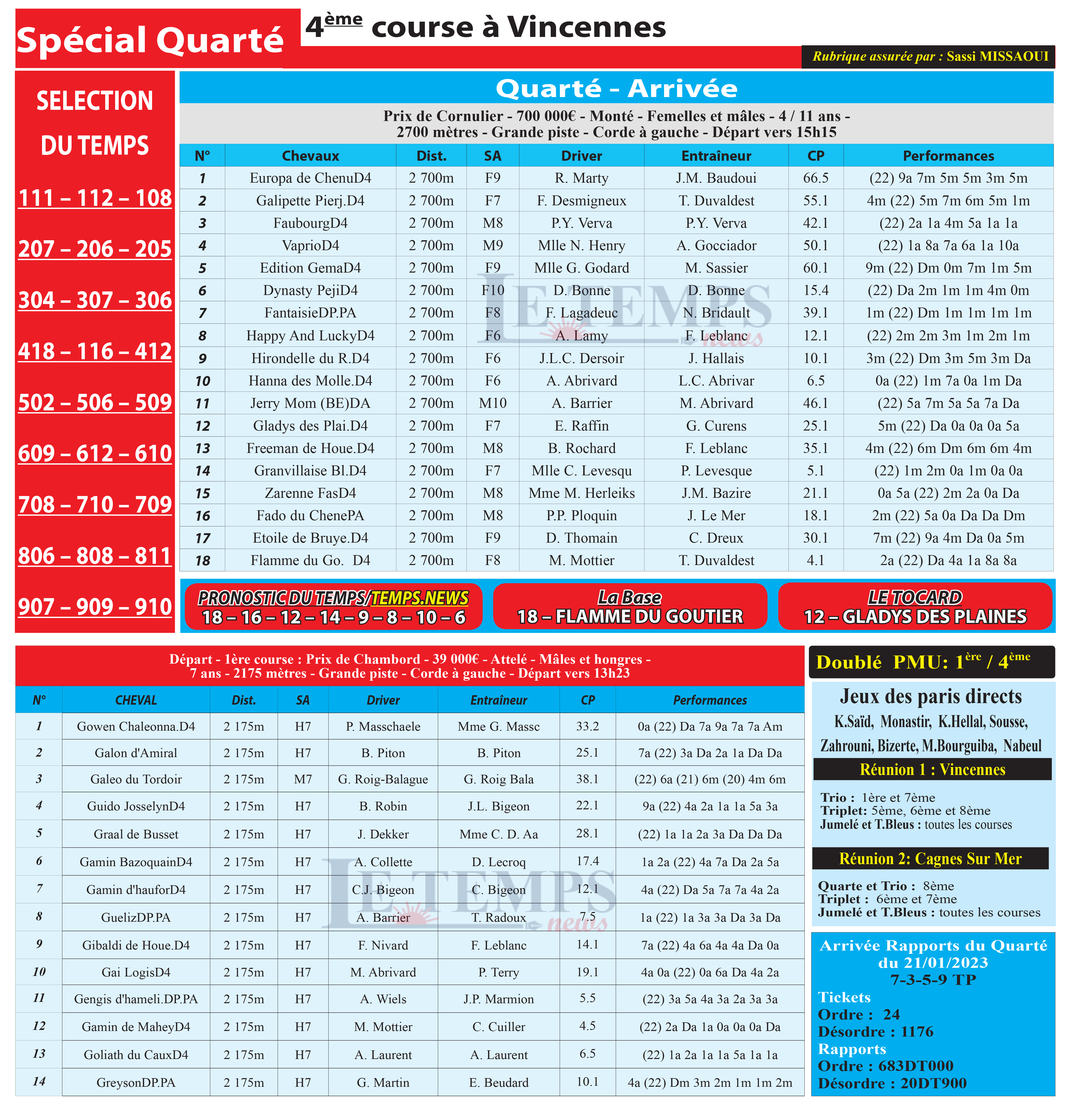 Notre spécial Quarté d’aujourd’hui, 4ème course à Vincennes, donne notre pronostic du Temps/ Temps News avec le cheval n°18 Flamme Du Goutier étant la base, tandis que le Tocard est le cheval n°12 Gladys Des Plaines.