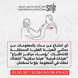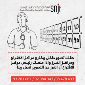 Le SNJT a, en outre, mis en lumière quelques recommandations adressées aux journalistes en ce qui concerne leur droit de filmer au sein et en dehors des centres de vote et de dépouillement, ainsi que leur droit à accéder à l’information qui doit être fournie de la part des représentants de l’ISIE et des présidents des centres en cas de besoin en soulignant que toute est considérée comme violation de ce droit.