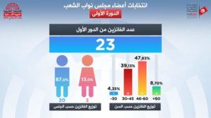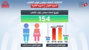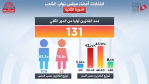 D’après les informations présentées durant la conférence de presse organisée ce lundi, le 30 janvier 2023, par L’ISIE en marge de la tenue du deuxième tour des élections législatives du 29 janvier courant, 131 candidats, dont 22 femmes et 109 hommes ont remporté des sièges à l’Assemblée des Représentants du Peuple lors du deuxième tour.