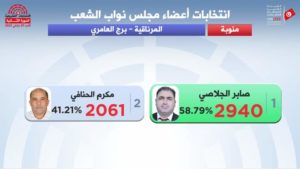 À El Mornaguia – Borj El Amri, le candidat Saber Jlassi a obtenu 2940 votes et le candidat Makram El Hanafi a eu 2061 votes.