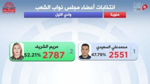 Candidats dans la circonscription de Oued Ellil, Mariem Cherif a obtenu 2787 votes et Mohamed Ali Saidi a obtenu 2551 votes.