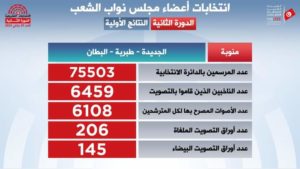 D’après l’ISIE, le nombre d’électeurs ayant participé au deuxième tour des récentes élections législatives au niveau de la Manouba sont comme est réparti comme suit : 6459 à la circonscription Jedaida – Tebourba – El Battan, 5374 à El Mornaguia – Borj El Amri, 4232 à la Manouba et 5610 à Oued Ellil.